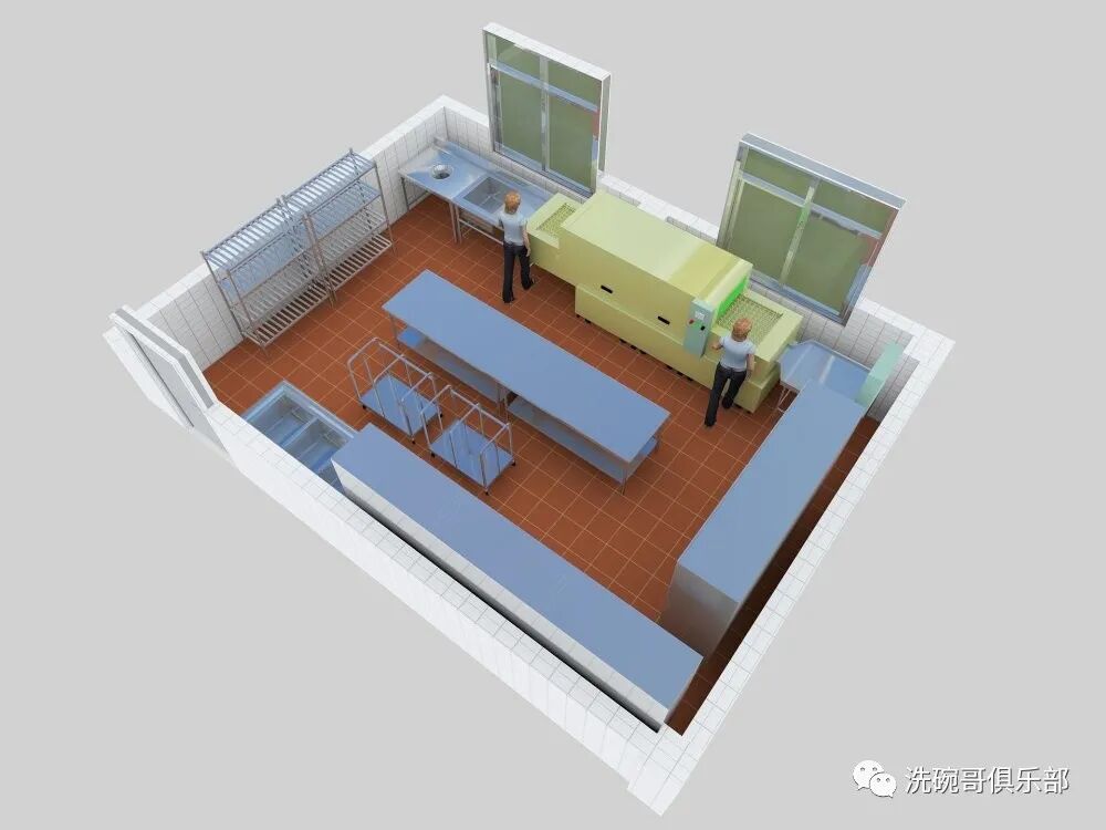 5、清洗、除菌:通过洗碗机传输带将餐具输送到洗碗机内,设有两道或多道喷淋清洗,第一道通过高压温水上下对冲,达到清洗效果,第二道高温漂洗,通过高温清洗最终达到除菌的作用。